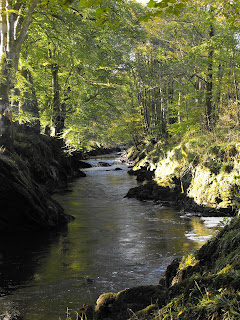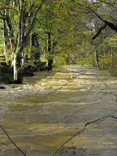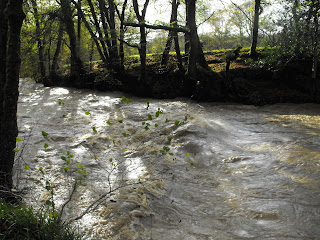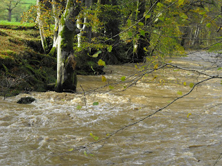As I mentioned earlier, we had a bit of rain here overight. Here are some photos of the river taken AFTER it had subsided a few feet. Before dawn it had been busy-bodying across our lane and the one the other side of the bridge, depositing mud and heaps of leaves in its wake. As we reached the first bend at the bottom of our hill, we saw a dead cow hurtle past, on its side and with its head sometimes flung up by the waves. It won't stop until it floats out into Carmarthen Bay or fetches up on the beach at Llansteffan . . .