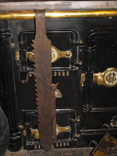 This is an old blacksmith-made chimney crane to go into the inglenook (in our next house, DH tells me). We have the support part it hangs from out in the barn. DH found this at the auction we viewed yesterday and went back and bought it for just £12 today. It has a lot of character and I love the little heart shape at the bottom. It needs a hook welding on, but nothing a blacksmith couldn't do in quick order.