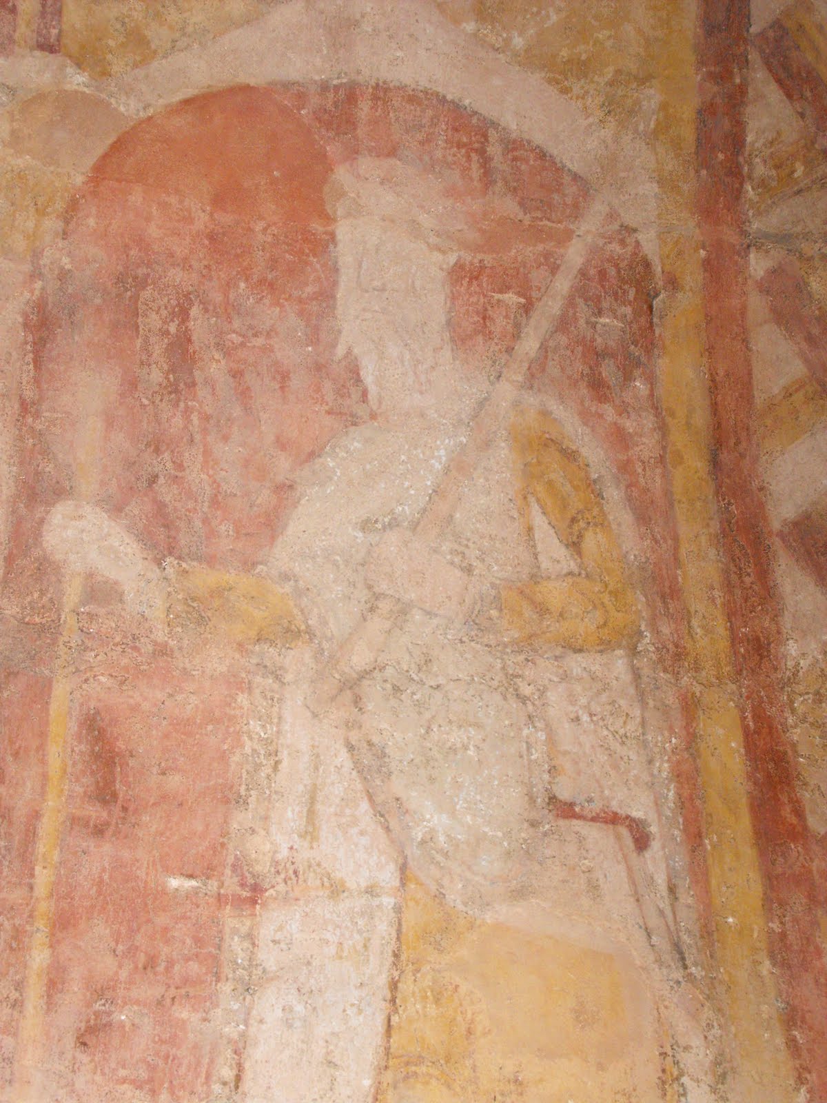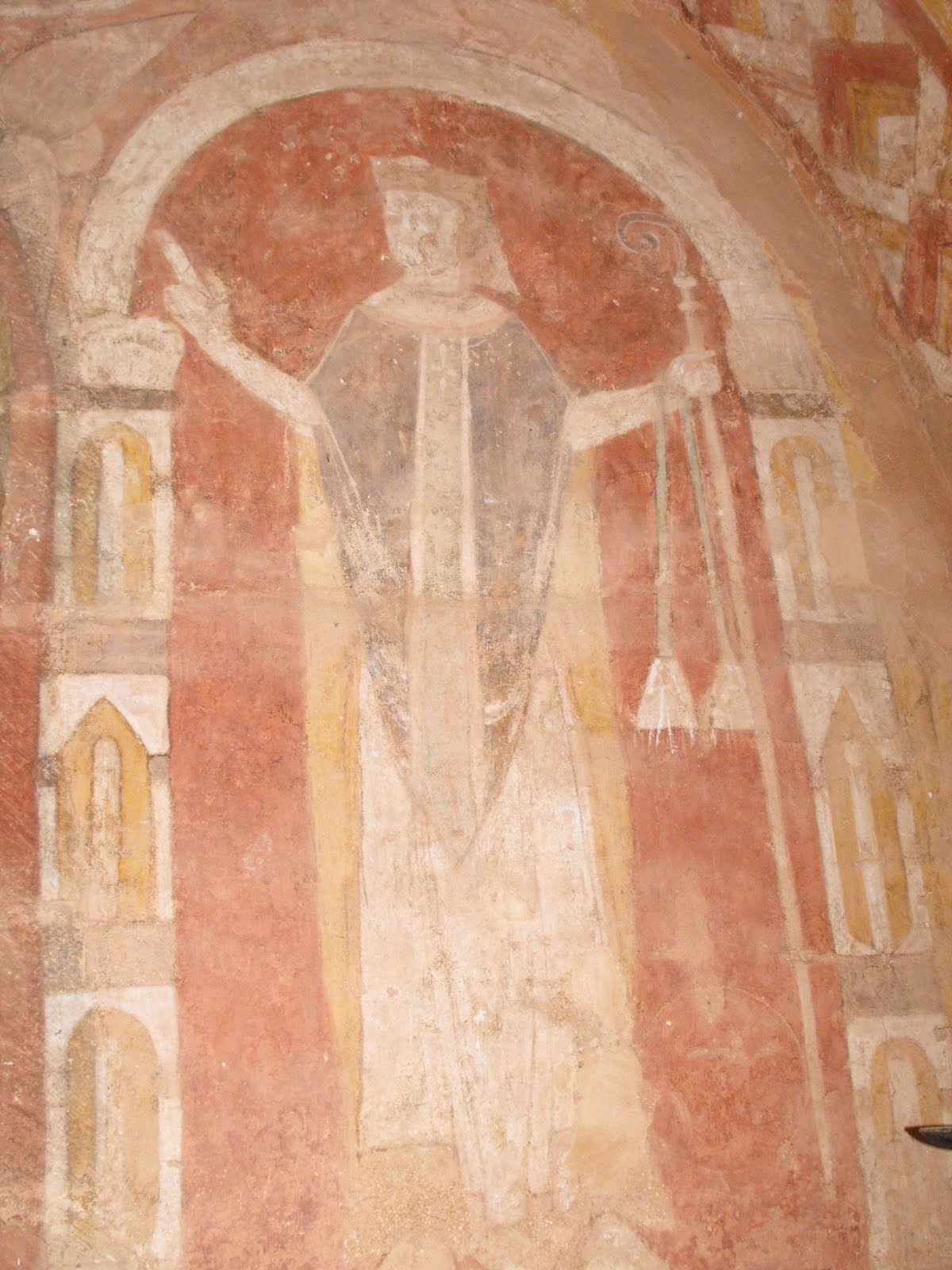 Above the simple round-headed windows there are representations of the heavenly Jerusalem, and between the windows and the east wall there are two figures with the hats and staffs of lay pilgrims. These are almost certainly Hugh and Walter de Lacy. The identity of the bishops painted on either side of the east window is not known, but they may be early popes.