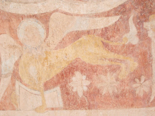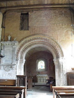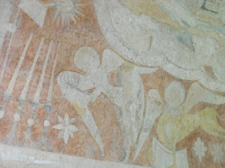 Today's post is one which got missed in despatchs around the time of my birthday back in April. St Mary's Church at Kempley on the Gloucestershire/Herefordshire borders is far too interesting to ignore, so I will tell you about it today. We had heard about its wonderful NORMAN wall paintings. Yes - Norman - that's 12th C (or elevenhundredandsomething to those of us who use their fingers for counting!) That they survived at all is absolutely amazing, but we must thank those with whitewash brushes after the Reformation, who painted over the marvellous artwork and thus saved it for posterity, although the colours are just a pale echo of what they would have been when the frescos were originally painted.