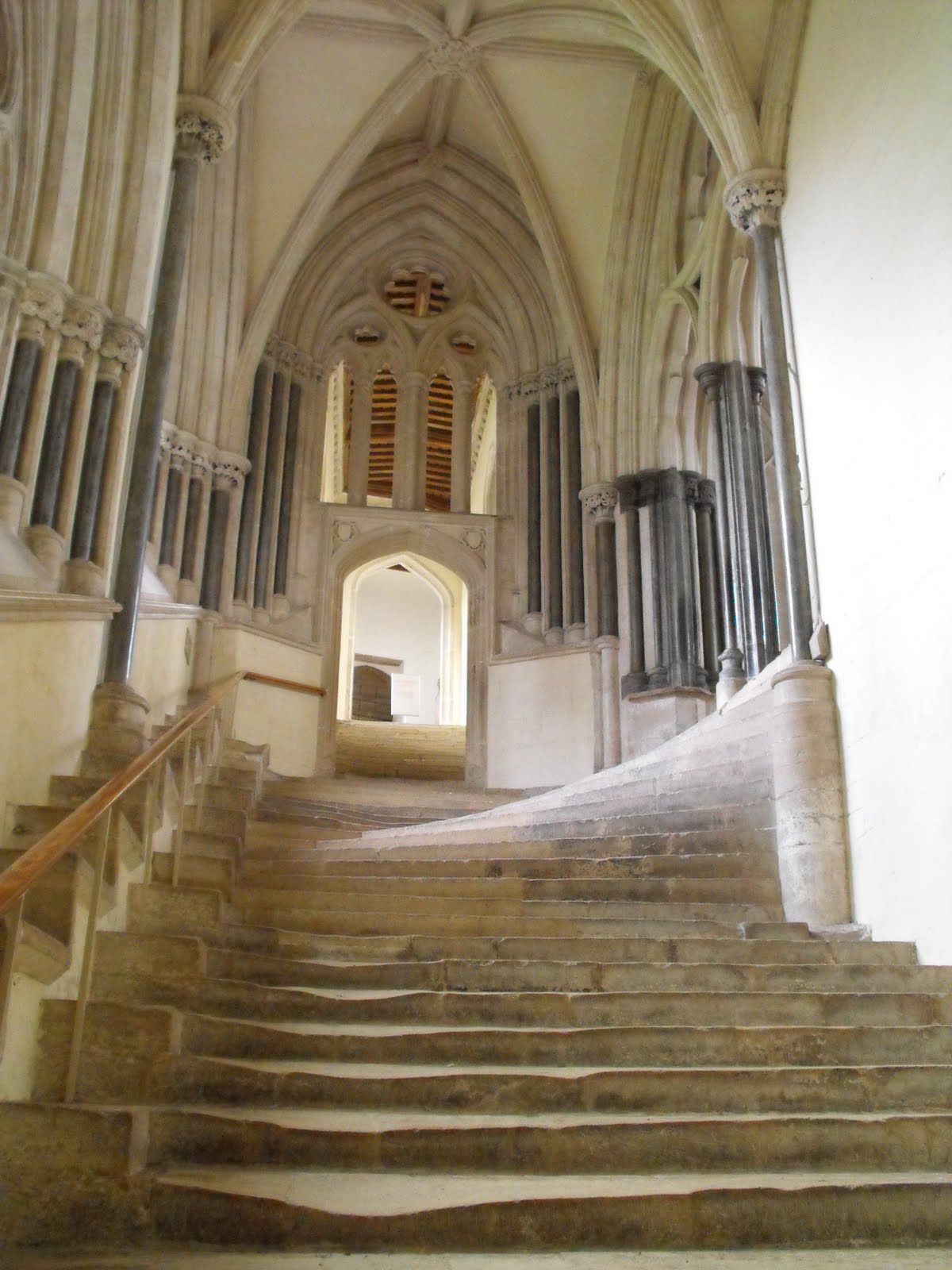The fabulous stairway and fan vaulting of the Chapter House steps, leading to the circular Chapter House. This dates from 1306. History of Wells Cathedral HERE.
