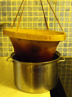 Now in the jelly bag overnight, and will be cooked up and potted tomorrow. The jelly bag, incidentally, IS scalded each time I use it, and sterilized with lemon juice too, but that does little to remove the blackberry and elderberry and damson stains . . .