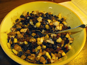 Begin by assembling your ingredients. I normally start making mincemeat with the first windfalls, back in August, but I forgot this year, and so I have got the scabby old apples from the £1 boxful we bought a few weeks back (and which got overlooked because I have been buying my favourites, Russetts, instead. Peel, core and chop.