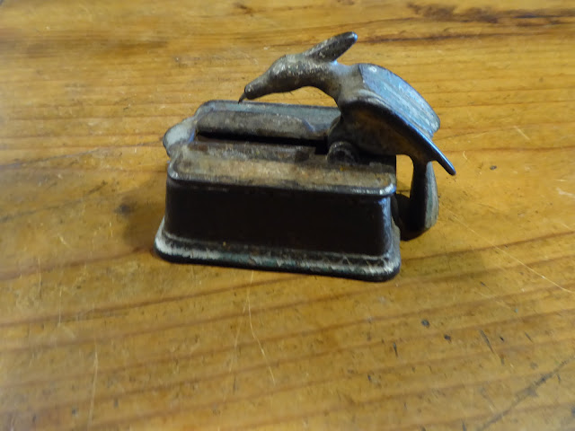 We had some good buys yesterday, and saw lots of dealer friends, either buying or selling there. My purchases are carefully sidelined for the next 2 day Antiques Fair at the Botanic Gardens in September. I've never seen one of these before - it's meant to be a Woodpecker (but looks more like a Pterodactyl!) and he grabs a toothpick when you tip him forward - or rather, he would have done in his past. He is a little the worse for wear now! A tick in the "different" category.