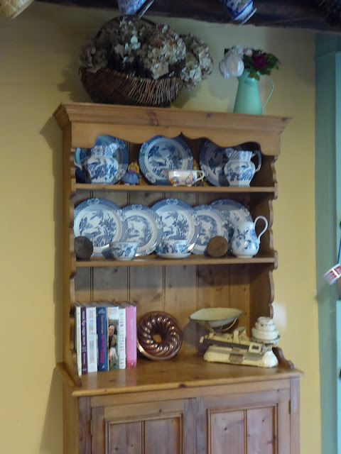The first new-to-me dresser, acquired in a dealer-swop last week for four kitchen chairs. It was looking a bit unloved when we picked it up - it had never been polished and the wood was dry and sun-faded, and a couple of the boards were loose on the back as it had been STAPLED together, rather than nailed. Obviously the cheapo end of the market when first sold. Now it is glowing and looking a lot happier decorated with the (bathroom! - it didn't get far!) "Yuan" china. The cream scales were one of the first things I ever bought at auction, That would have been 1985. They came from the one at Blandford Corn Exchange and cost the grand sum of £3. They were in regular use until recently, when I got a rather smart singing and dancing set of modern scales with a good sized bowl on top which is now my go-to set, even for pounds and ounces weighing. The basket (with Hydrangeas) on top is one that my dear departed friend Annie made.
