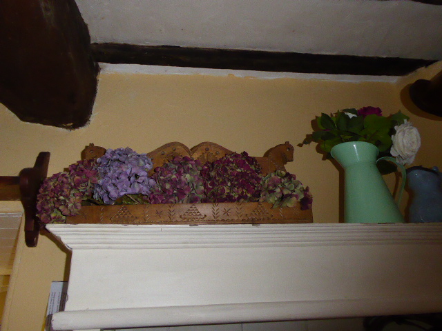 One is this lovely old German spoon rack, beautifully decorated. I have put some dried Hydrangeas along it and moved the blue Hydrangeas in one of my late friend Annie's hand-made (by her) baskets over on the pine dresser: