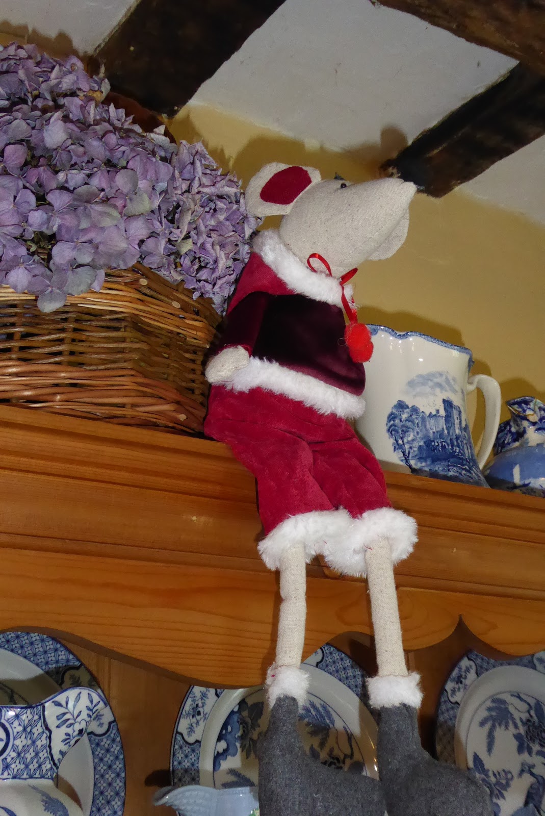 I decided that as December has arrived, I should go up into the attic and bring out the Christmas decorations so I could put a few things up around the house. First, the two meeces I already had came out to join Green Mouse in the celebrations.