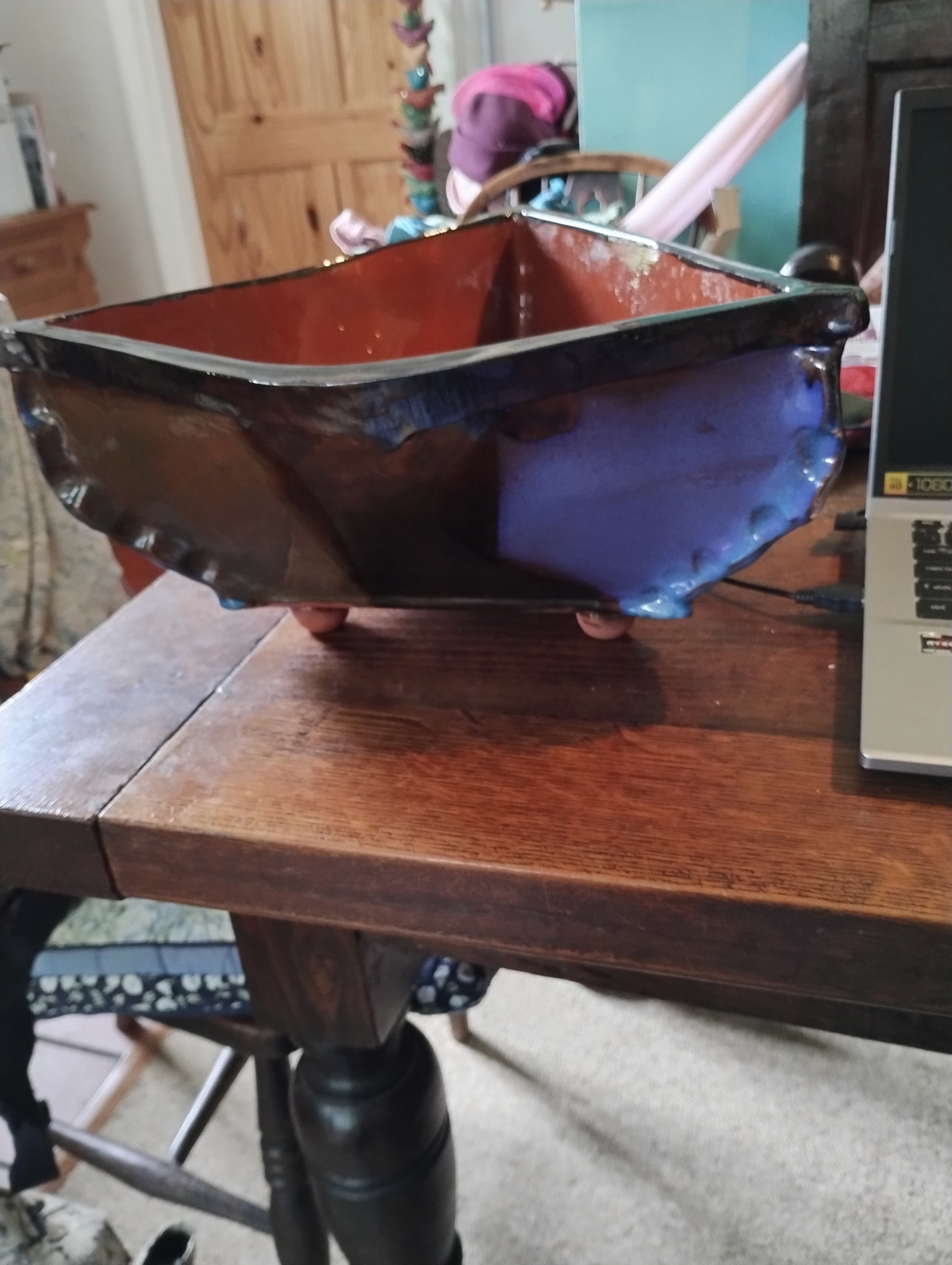 I took myself out into the stables to bring in the nearly empty box that had the huge piece of art pottery (great shape and imaginative glaze) from Aeron Pottery I think. Then I had to find the bigger box which I knew had various items coloured glass in (that would be on trend right now). Other folk had twigged that trend when it came up on a posting online - but at Malvern there were tables with masses of green glass collections, and other old pieces which aren't what people are looking for from what I surmise - hoping I have the balance right. I found out about some vintage cut glass coloured Roemer hock glasses I had bought at auction around 2018 or so - I think they are Val St Lambert. I also found both the Housa black ceramic pots (Nigerian) that also came from auction around a similar period and hadn't sold. Lens told me they were ink pots and rare. One is a/f but the other perfect. The holes in the top are where leather thongs were threaded through for carrying. Plus a little vintage Crown Devon elephant, and a 12" Spider Conch shell. It was like finding treasure! These boxes haven't been touched since we moved.