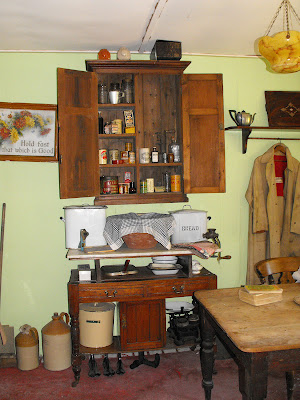 One view of the kitchen with its pots and pans, scales, zinc washing tub, and some advertising bottles and cans. The wooden cupboard was called a tallboy in our house, where we had one like it (ours ended up painted battleship grey and turned into a castle by my husband for our children!)