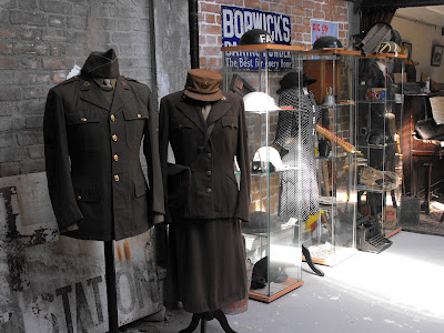 Here is the "Tin Shed" which you go into first, and it is packed with original uniforms of various countries, and all sorts of artifacts which have largely been donated. The proprietor gave us a guided tour and we could have talked until the cows came home, exchanging various bits of information from our particular families. You can just see (above my husband who is in the white top far right) a re-enactment from Arnhem, when the soldiers were hiding out, having been given the wrong frequency crystals for their radio equipment and they were unable to make contact. Apparently they were so short of food and water, that they were reduced to taking water from lavatories and flower vases. There was a lot more to show you but as I can't afford to buy new photograph space from Blogger, I am having to create more space on current posts by wiping out photos on much older ones . . .