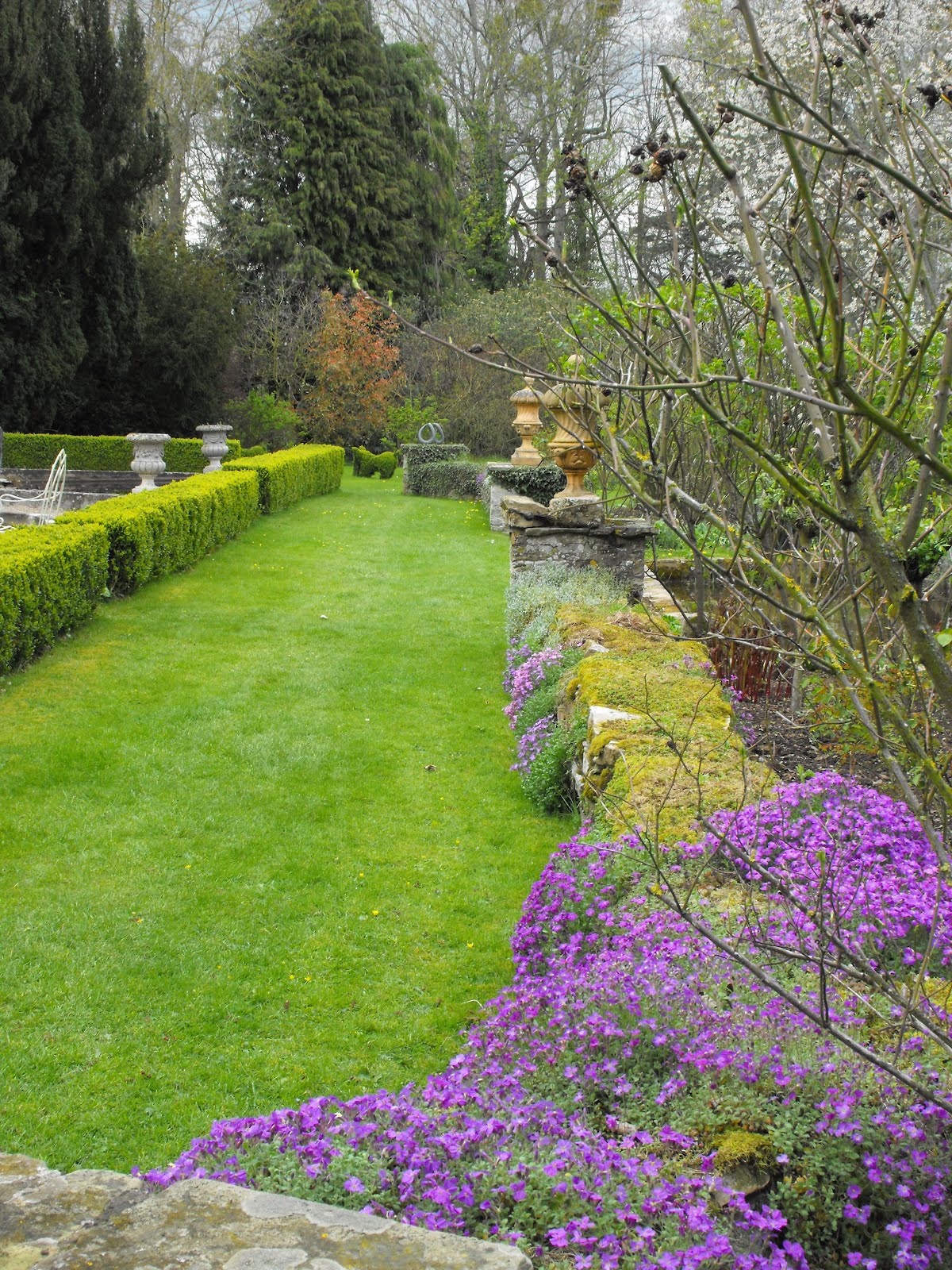 A grass walkway with Aubretia highlights, extends across the middle of the formal gardens.