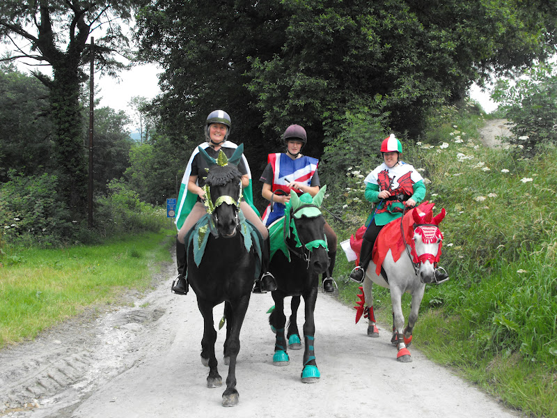 Just as we got back on Saturday, we spotted these three riders who were taking part in a sponsored ride across Carmarthenshire, linked to the town's Merlin Festival. They had been up to our local Llanfynydd Show and were now making their way back to Carmarthen via local lanes and then a Police Escort once they reached the A40. I thought the "dragons" were brilliantly done - the two below even had colour-co-ordinated overreach boots!