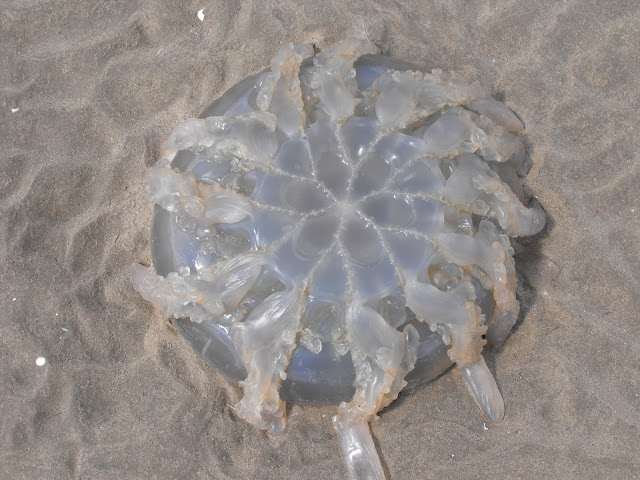As you will have seen from the change of header photo, we headed for the nearest bit of beach earlier in the week. Our nearest beach is either at Llansteffan or opposite at Ferryside. Both have good clean sandy beaches. One of the first things we saw was this upended jellyfish. It was interesting to see what it looked like underneath - 6 central bits, and then 12 external divisions and 12 arms . . . I think it is probably a Moon Jellyfish.