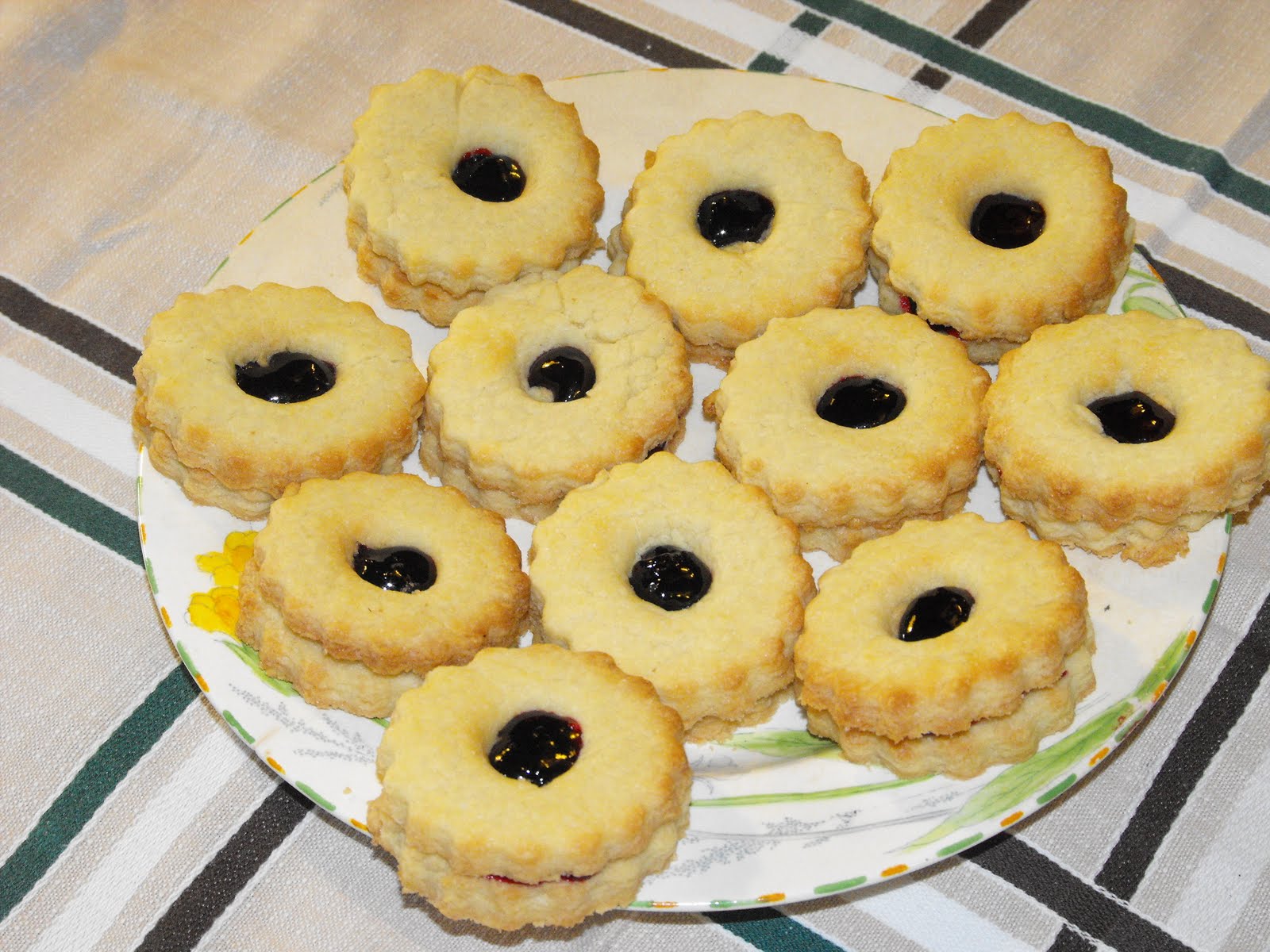 Remove from the oven and place a teaspoonful of jam in the centre of each whole biscuit round. Spread to 15cm from the edge (in other words, not too close if you can't be bothered to measure, which I couldn't be). Place the cut-out rounds on top. Return to the oven and cook for a further 5-6 mins by which time the biscuits will be evenly cooked and the jam hot enough to stick them together. Leave the biscuits to cool for 5 mins before transferring to a wire rack. Or if, like me, you browned them a teensy bit in the first place, jus sandwich with jam and leave to cool. They are like shortbread, and DIVINE!
