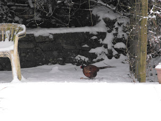 This is my pet pheasant! He is picking over a lamb bone we put out for any interested parties last night, but I think the foxes were staying underground, as no foxy pawmarks near it, and it hasn't been taken.
