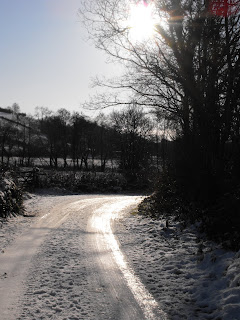 OH and I had a walk up to the junction today, just to see how bad the roads were. They're bad. No chance of getting out at all as the snow has been compressed to an ice-slick like glass. I was hoping that we might creep out to Llandeilo with Honey to get her eye checked, but no chance.