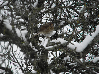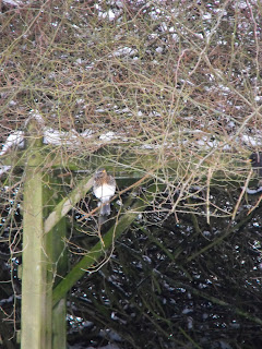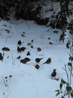 I have spent a good time this morning both bird watching, and feeding them. Poor little chaps are desperate in this weather. Maximum sightings at any one time: 12 Blackbirds; one Fieldfare; 3 Redwings; countless Sparrows, Chaffinches, Blue and Great Tits; Nuthatch; Greater Spotted Woodpecker; about 15 Jackdaws and as many Starlings, a Robin, a Pied Wagtail. I have tried to spread their food about as much as possible, as the Blackbirds are wasting precious energy fighting over the apples. I had some rubbery carrots, so I chopped them up small with two chopped potatoes, and boiled them up for the birds, and some Lasagne sheets (well out of date) broken into little pieces too. They have had fresh water in the drinking/washing bowl under the patio table. This and the two manky old chairs were going to be recycled in the autumn, but we never got around to it, are now proving useful as feeding stations, and the only snow-free area is under the table, which is where I have put a big pan of water.