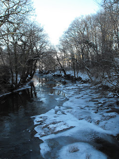 Down by the river, looking upstream (especially for Yarrow, whose favourite spot this is). The slate slabs along the riverside looked like they had been dredged with icing-sugar.