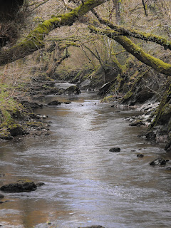 The view downstream. We turned around here as it was starting to get boggy underfoot on the stream bank, as the alder carr woodland came right to the river's edge. Years ago I went further on and found a place amongst the Bluebells where the Otters had been playing. Scampering round on a loop and then sliding down a muddy bit into the river. one of the few areas along the bank they could do that as it's mostly bedrock.