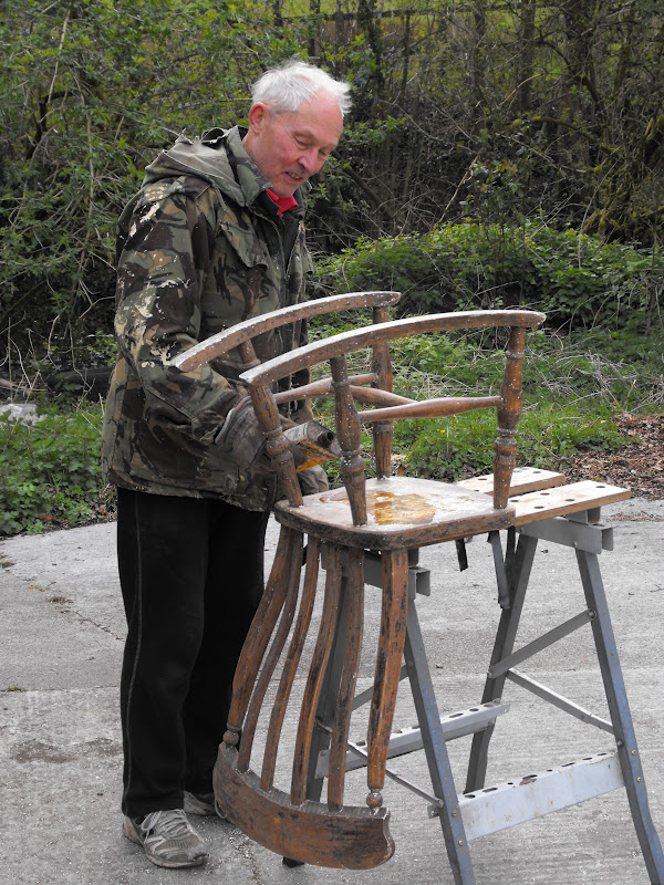 My husband working on a rocking chair which someone had decided to paint white (emulsion fortunately, so easier to get off).  You'd think we were back in the 1960s when beautiful pieces of furniture were frequently "modernized" with a coat of white gloss.  Anyway, it is now just about finished, so I shall put up a photo of the renovated chair in a day or so.
